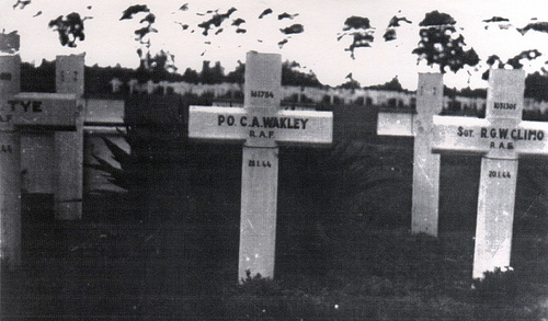 The crew's graves at Berlin 1939-1945 War Cemetery. These are the temporary wooden crosses erected prior to the involvement of the Imperial War Graves Commission, who would erect the permanent headstones. Photographs like this one were sent to the families by the British Army Graves Service.