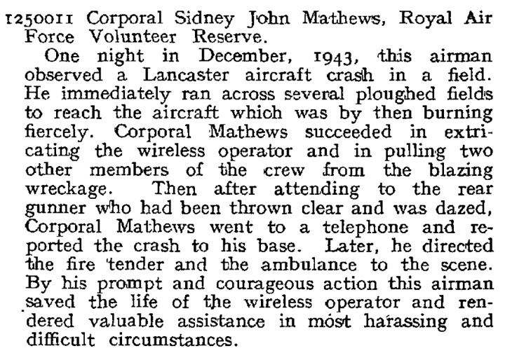 There must have been many quiet acts of courage at the scenes of the crashes on the night of 16/17 December 1943. Most would have gone unnoticed except by those present, and we are not aware of any other medals for bravery than the one described here. This was the British Empire Medal, awarded to a member of ground crew at RAF Station Bourn for the rescue of the wireless operator Joe Mack, who featured in our 11 December post