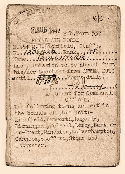 We have solved the mystery of the Bullimore ration coupon on the last post and where it came from (an anonymous donor). Looking through the Bullimore folder, we came across this other document about RAF restrictions on movement in 1943. ‘Within the bounds of this Unit’ meant those towns which an airman based at RAF Lichfield and carrying this pass was allowed to visit. This brought a wry smile given the current situation of lock-down in the UK and other countries.