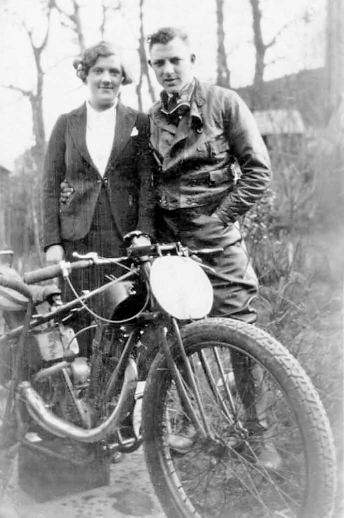 The woman in the photograph is Billy’s wife, Florence Amelia, known in the family as Milly or Molly. Billy was an avid grass-track rider and when he did sidecar-racing Milly was his passenger.