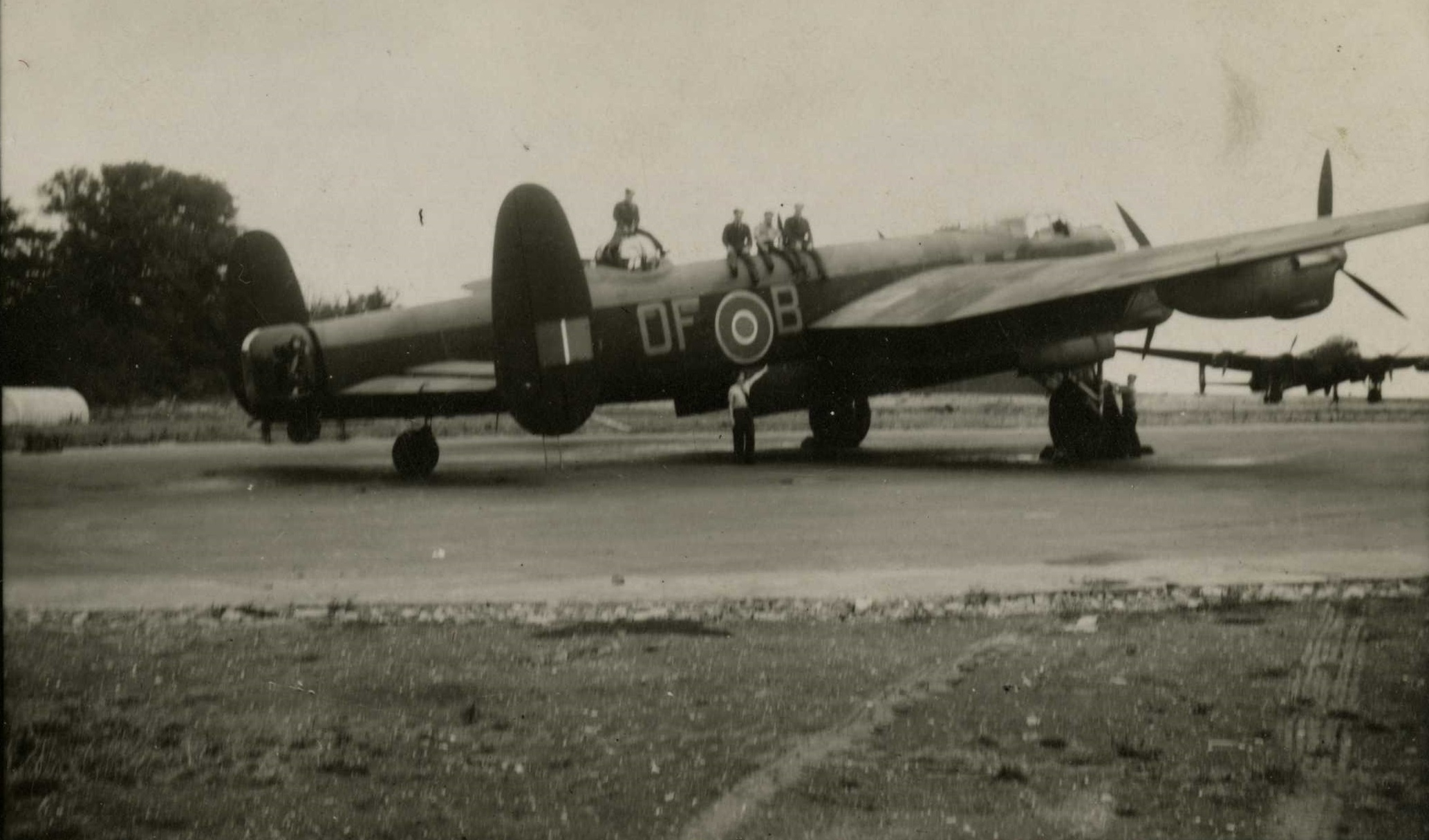 All Lancaster aircraft had squadron codes and individual letters, which meant that they could be easily identified when in the air. One of our all-time favourite photographs shows OF-B (B-Beer), a 97 Squadron aircraft, at Bourn in the summer of 1943. One of the ground crew is proudly pointing at the aircraft letter. (Courtesy of Jack Hill.)