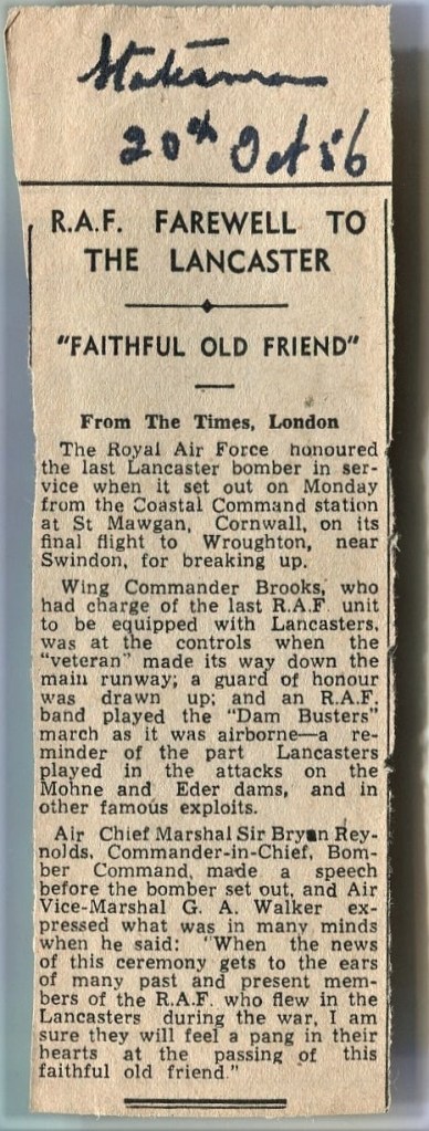 We have recently been working with the logbook, prisoner of war log, and other papers of John Henry O’Neill, a bomb aimer with 405 Squadron, who was shot down on 3 June 1944. There is a great deal of interest in these papers, but one small item caught my eye today. Tucked into the prisoner of war log is a yellowing newspaper clipping, describing the end of the last Lancaster on active duty on 20 October 1956. Also tucked into the logbook is the card of the Lancaster included on this post. Clearly, the aircraft was of great significance to John O’Neill. There is also a drawing of a Lancaster in his prisoner of war log.