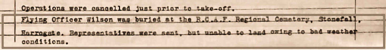 As the ORB indicates, the only body recovered was that of Flying officer Thomas Ferguson Wilson, RCAF, who is thought to have parachuted out of the aircraft. He is buried at Harrogate’s Stonefall cemetery.